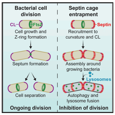 What is this about? We discovered that septins, a component of the host cytoskeleton, recognize the cell division site of intracellular bacterial pathogens such as Shigella. We found that septin recruitment to dividing bacterial cells is promoted by the presence of cardiolipin, a curvature-specific phospholipid enriched at the bacterial division site. Once recruited, septins assemble into cage-like structures around growing bacterial cells, restricting their proliferation by targeting them to autophagy and lysosomal fusion. Our findings reveal a novel mechanism by which the host cell can sense and defend against intracellular bacterial infection by recognizing the unique geometry and membrane composition associated with bacterial cell division.