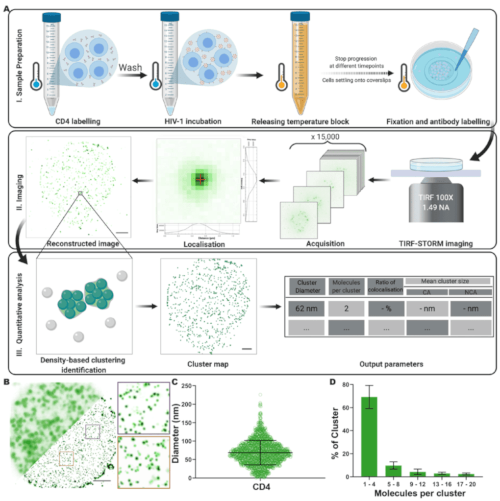 Single-molecule super-resolution imaging of T-cell plasma membrane CD4 redistribution upon HIV-1 binding, Yuan Y, Jacobs C, Garcia IL, Pereira PM , Lawrence SP, Laine RF, Marsh M, Henriques R, Viruses (2021).